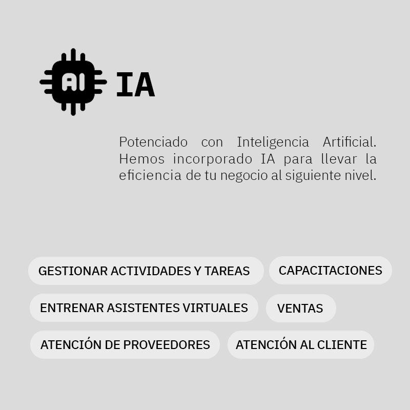 Además, integramos modelos de IA para potenciar nuestras capacidades, asegurando que nuestro software evolucione constantemente para satisfacer tus necesidades empresariales en un entorno cambiante.